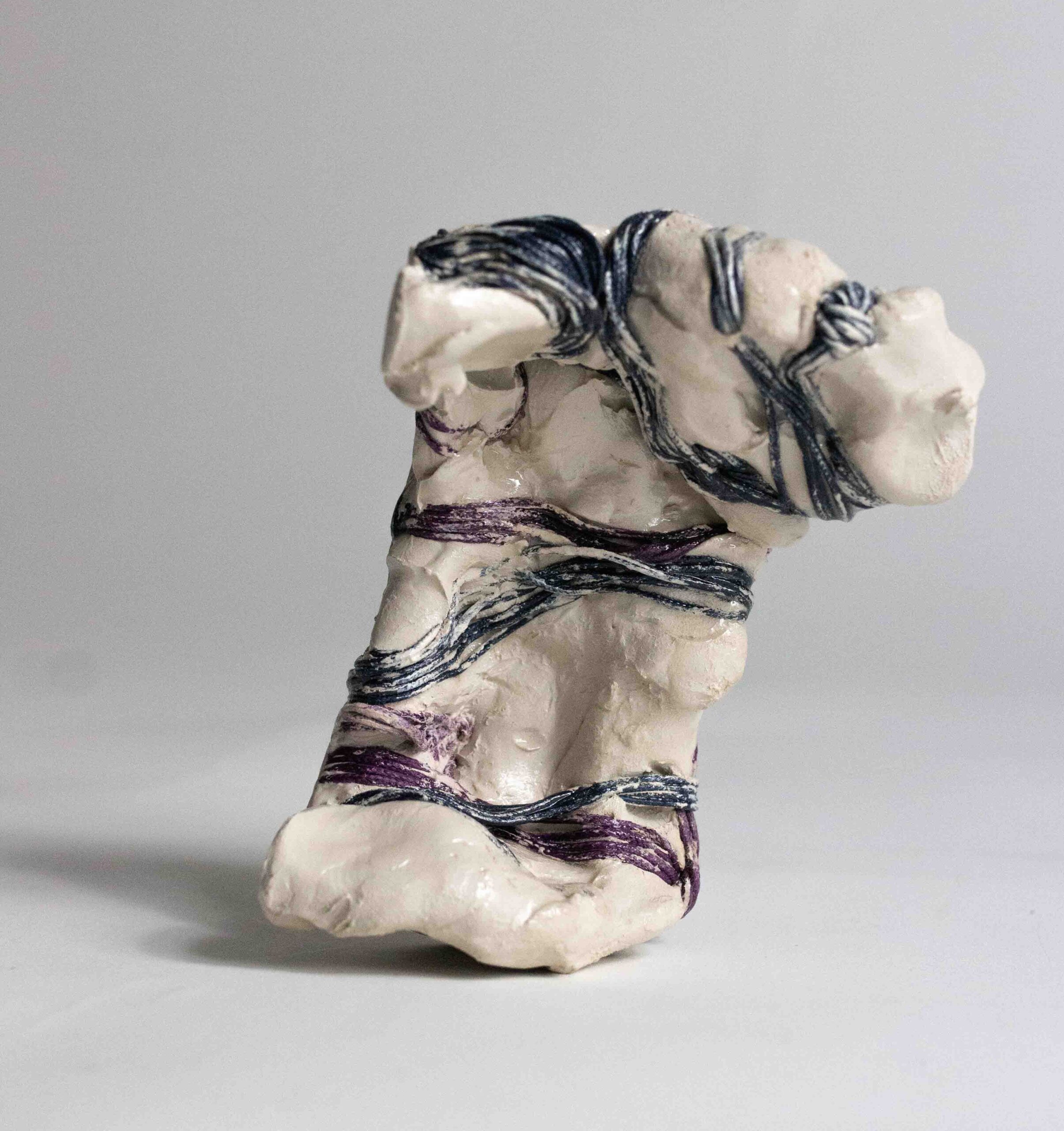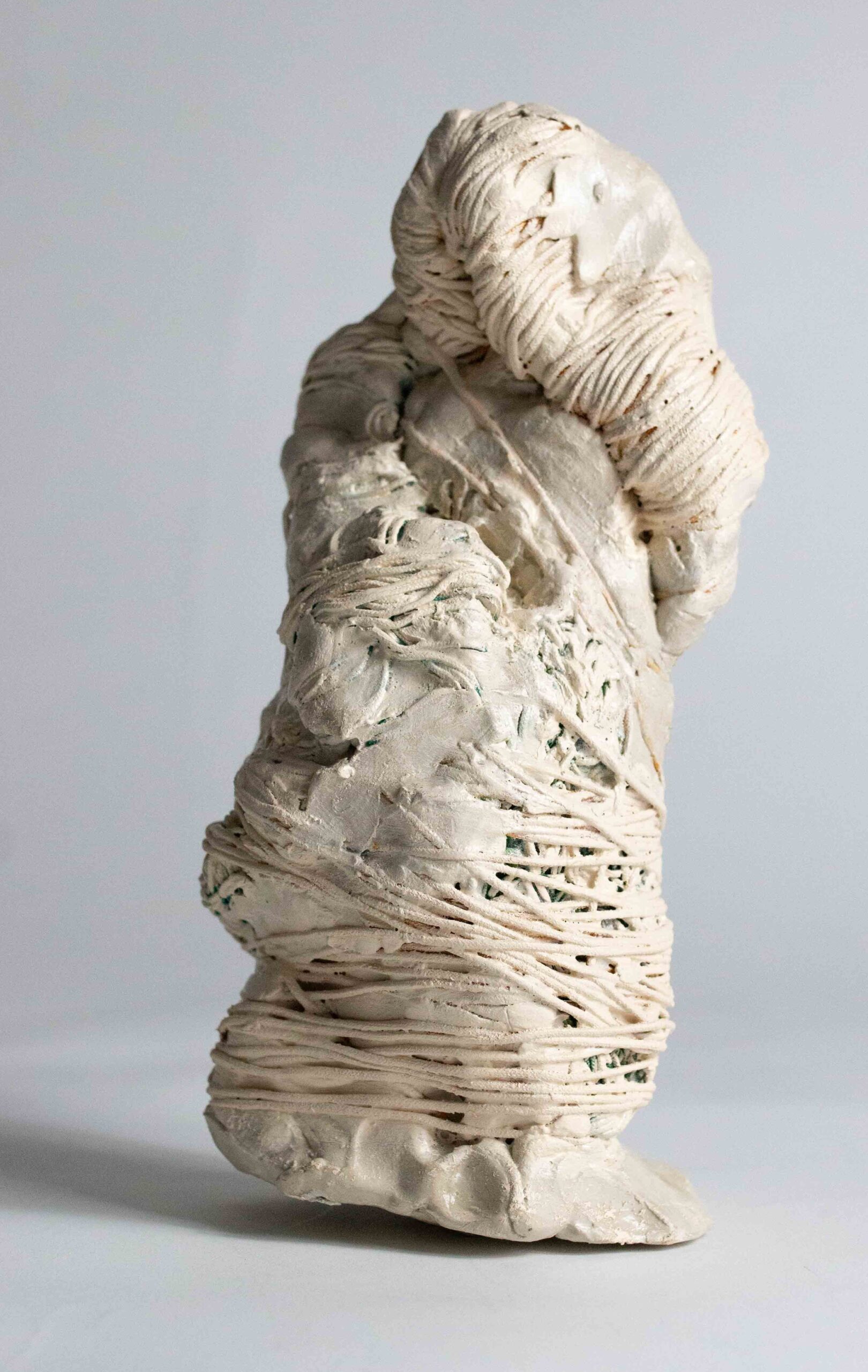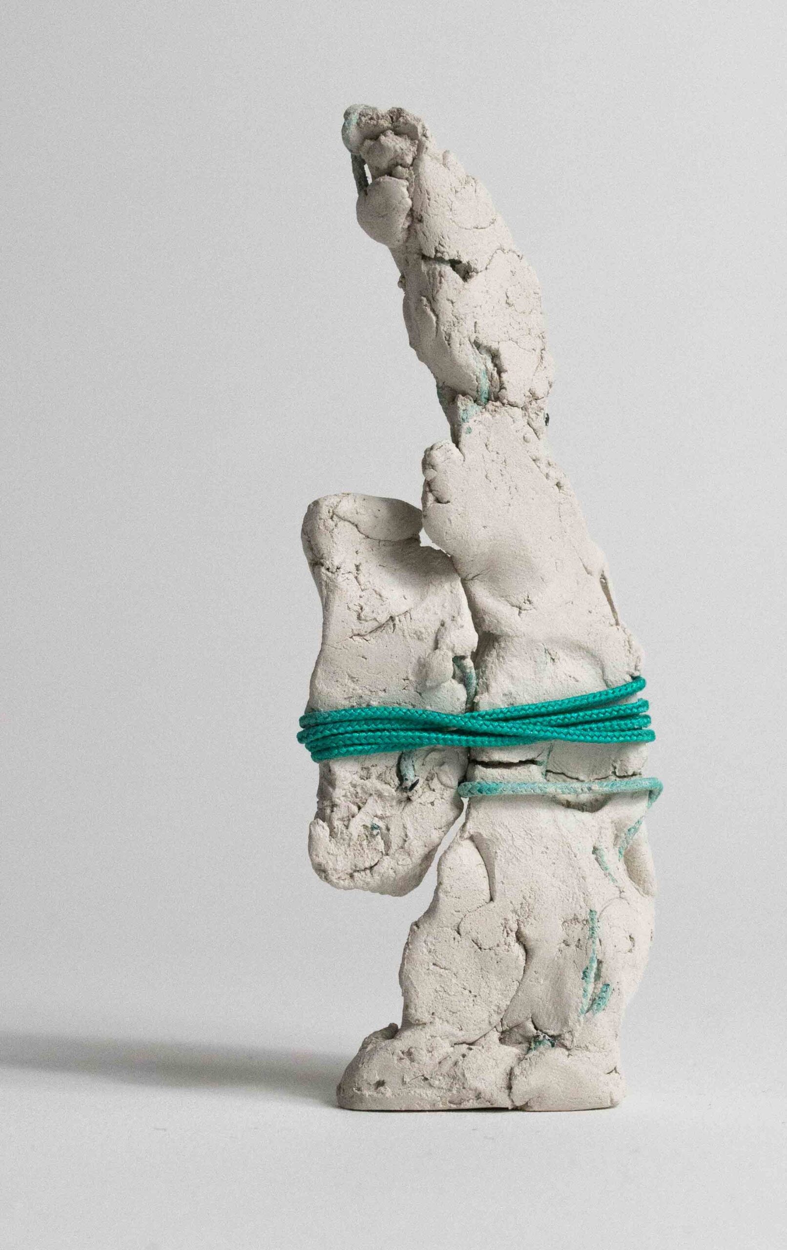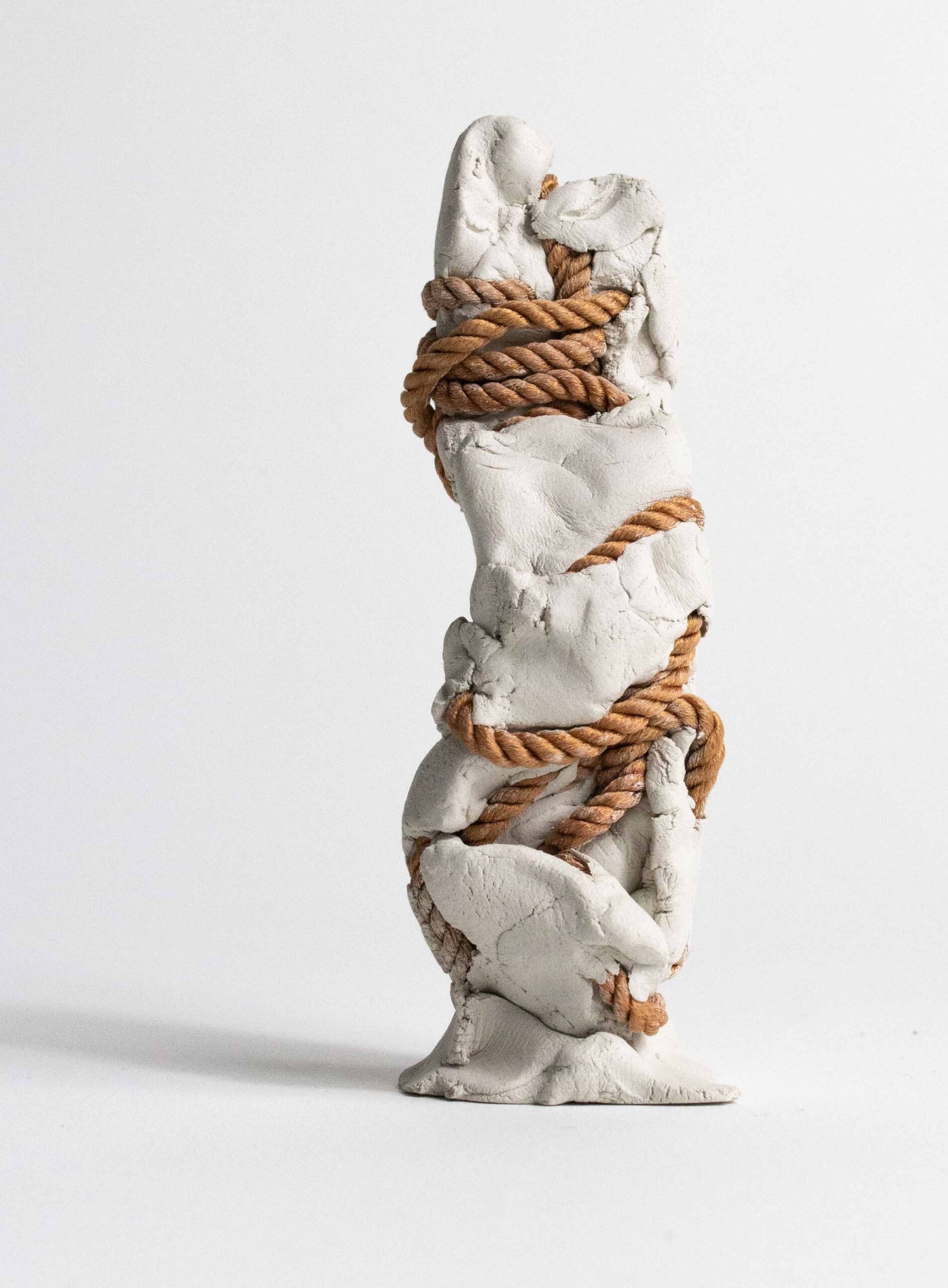 I compose these morphologies by combining textile work made of stretched threads, knots and braids with steel or clay. The combination of a hard, rigid material with a supple, malleable thread brings together the organic, the visceral and the structural, the skeleton. The roped material supplants the original body, healing wounds like a graft, a tutor or a prosthesis. Unfired clay remains alive, in the making.