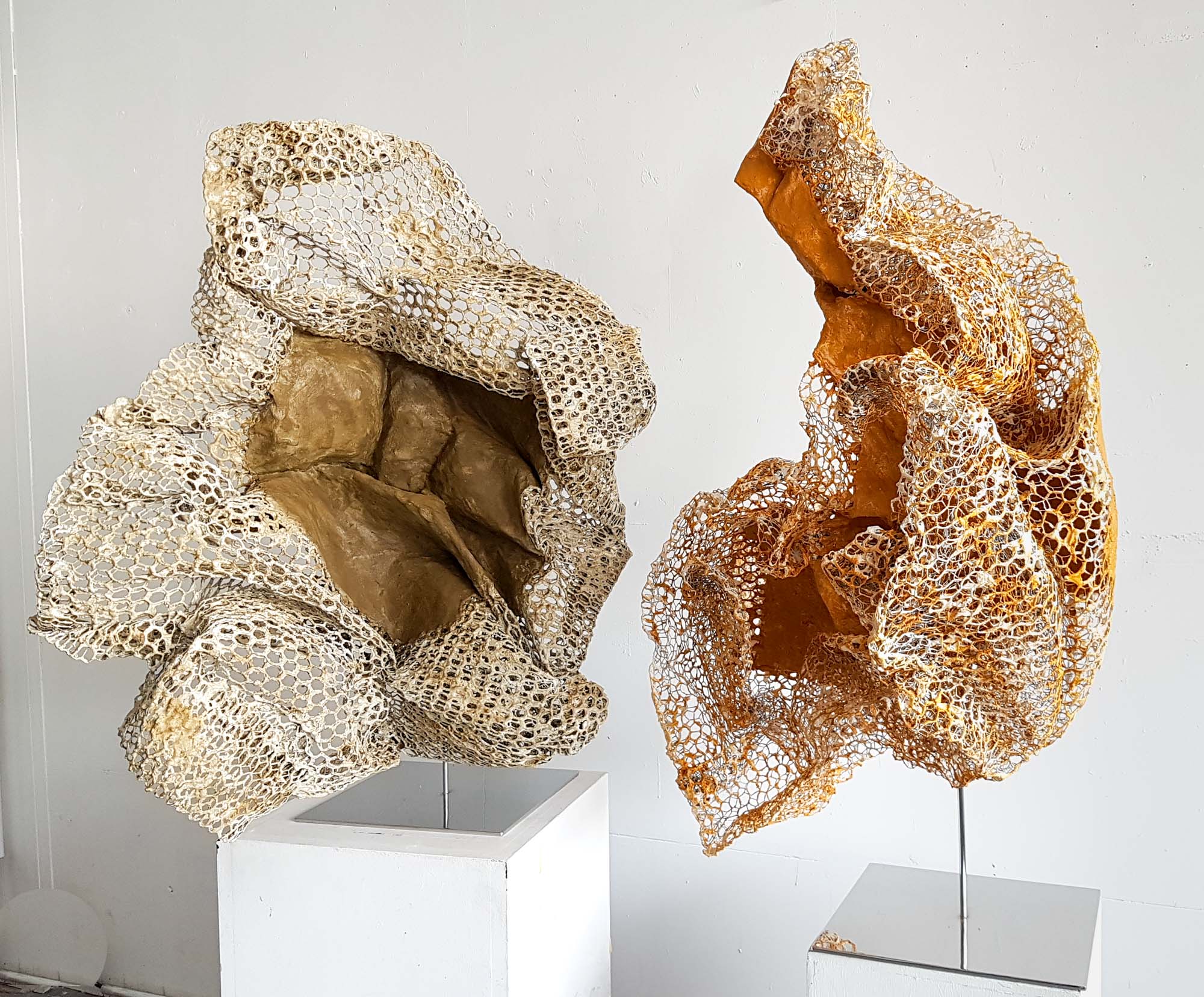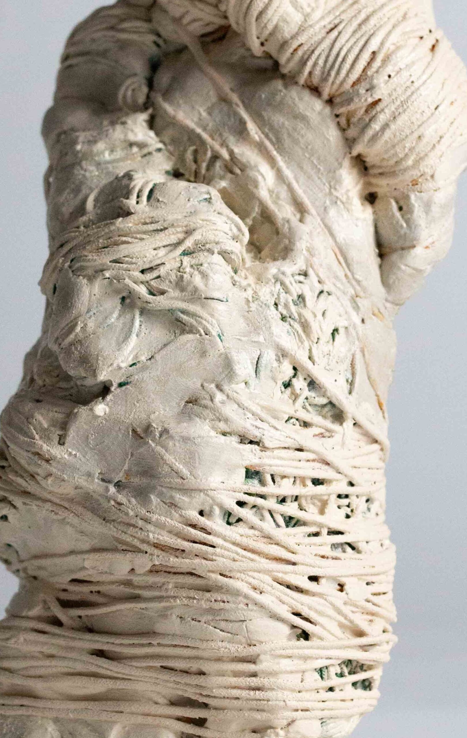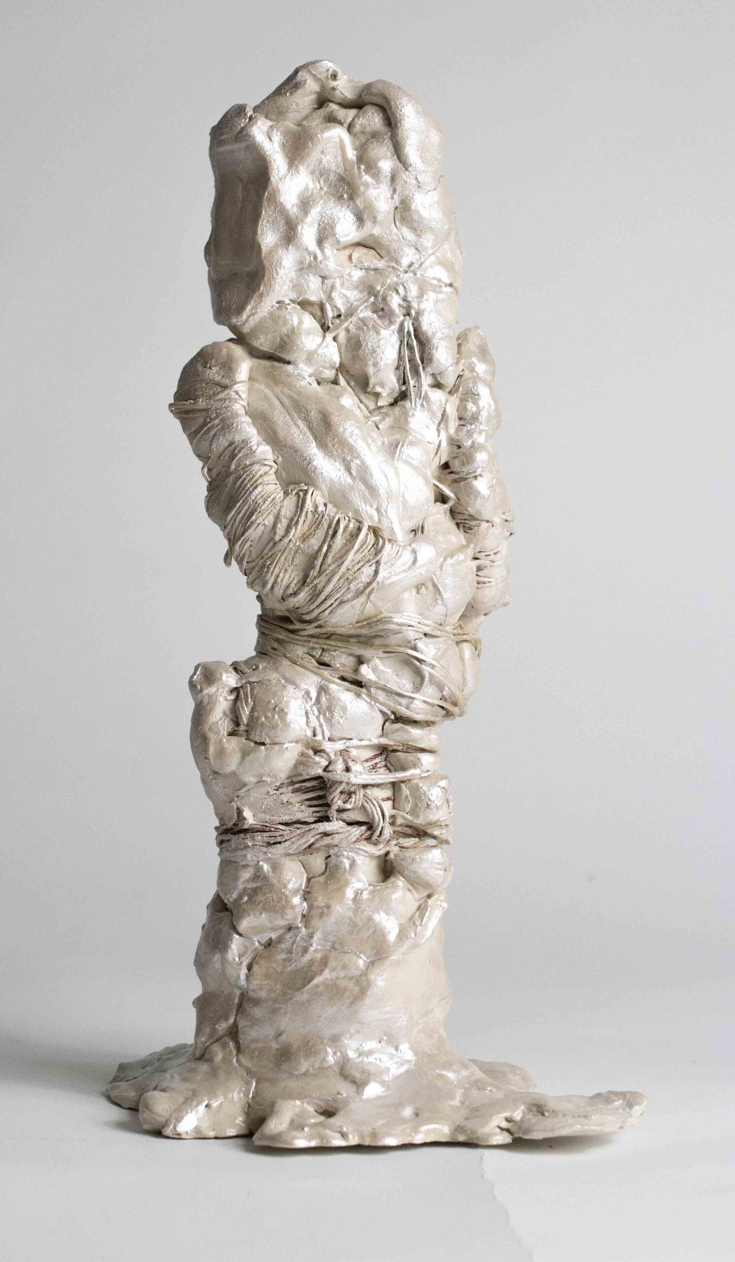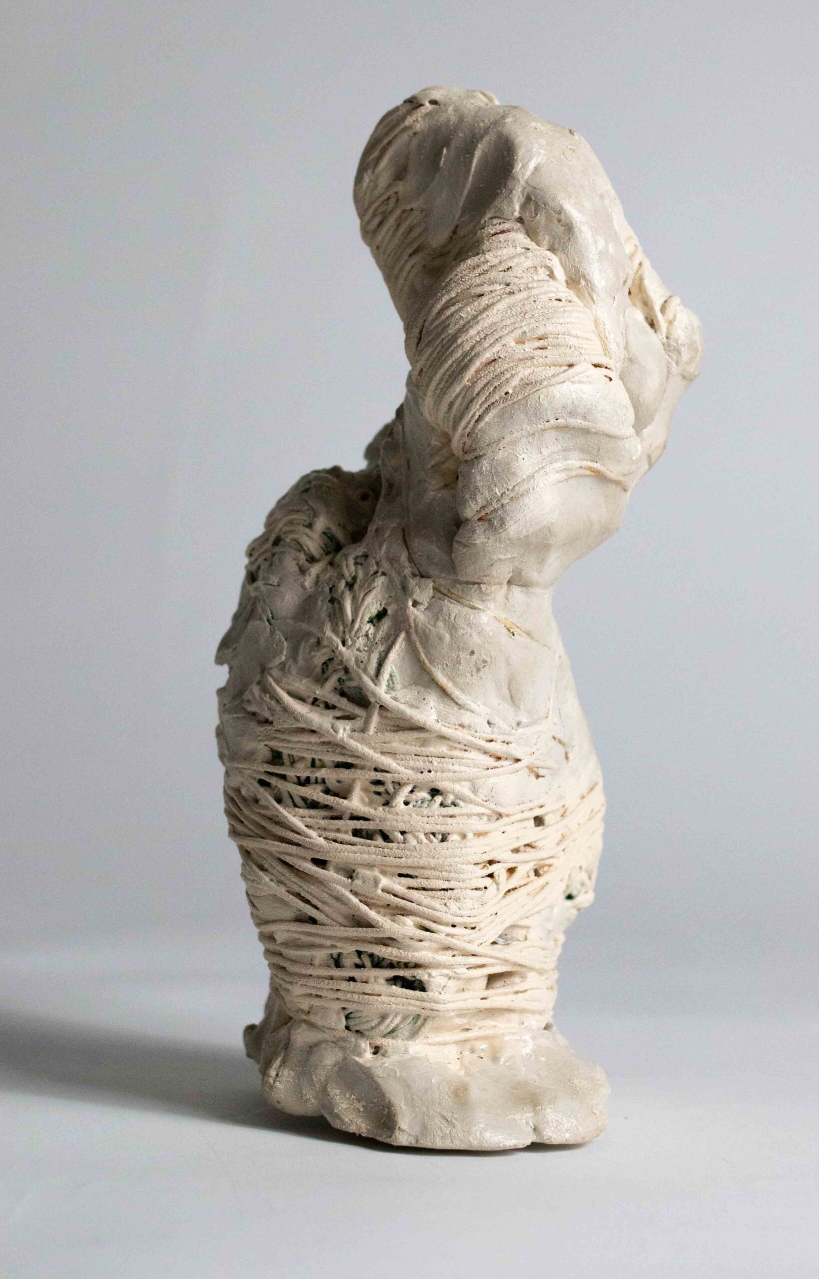I compose these morphologies by combining textile work made of stretched threads, knots and braids with steel or clay. The combination of a hard, rigid material with a supple, malleable thread brings together the organic, the visceral and the structural, the skeleton. The roped material supplants the original body, healing wounds like a graft, a tutor or a prosthesis. Unfired clay remains alive, in the making.