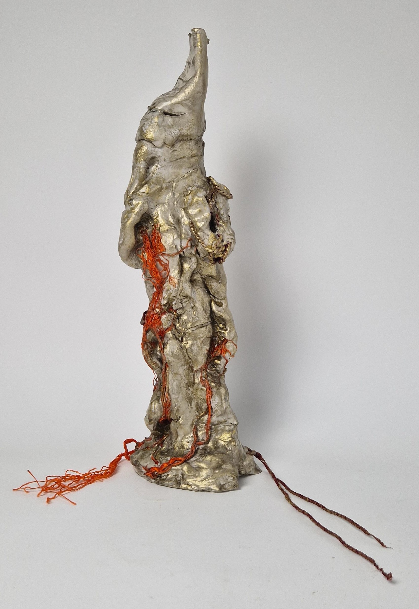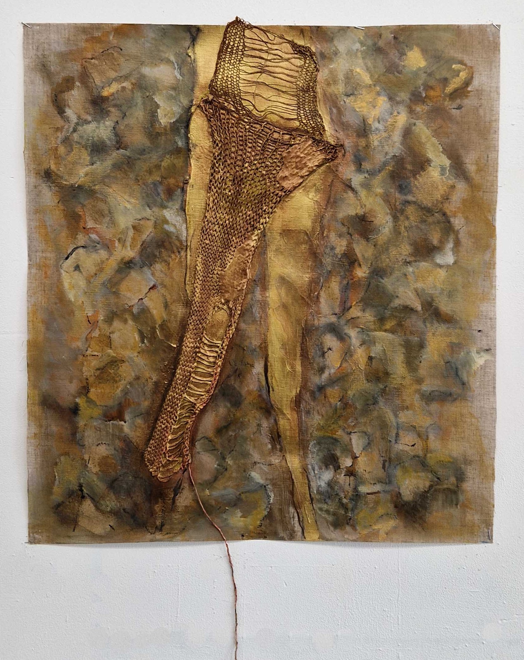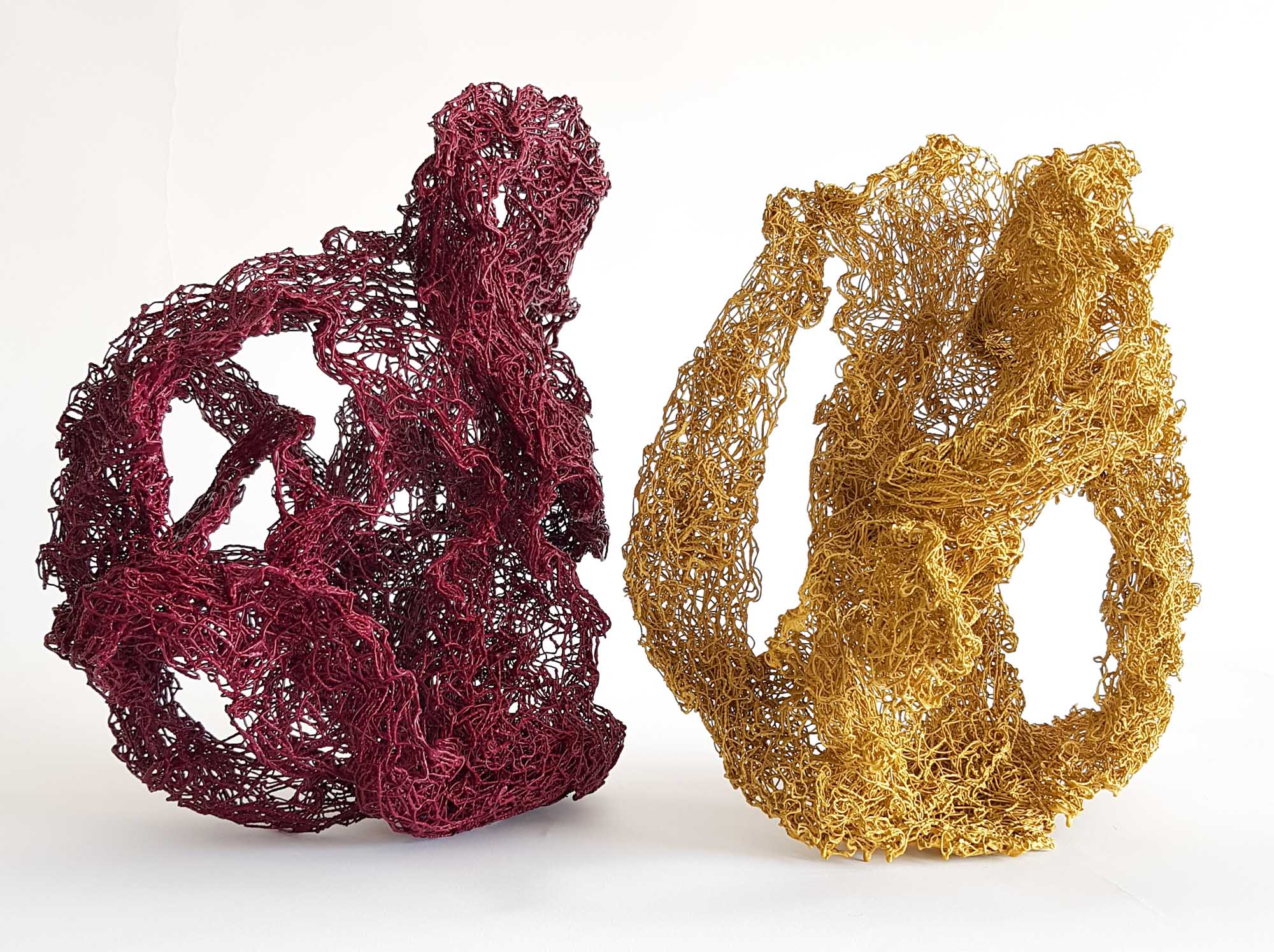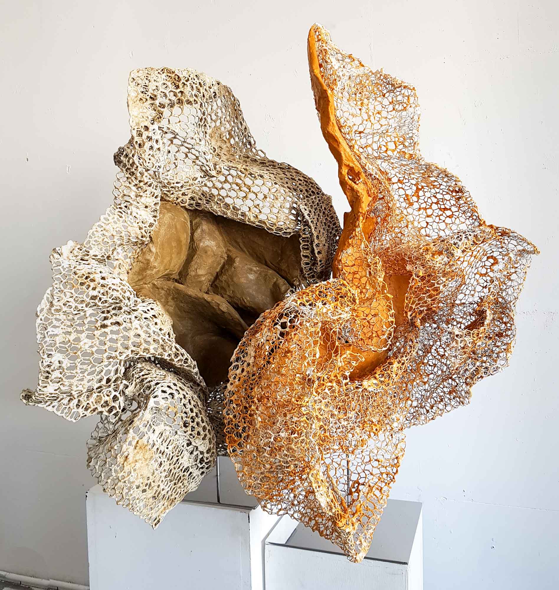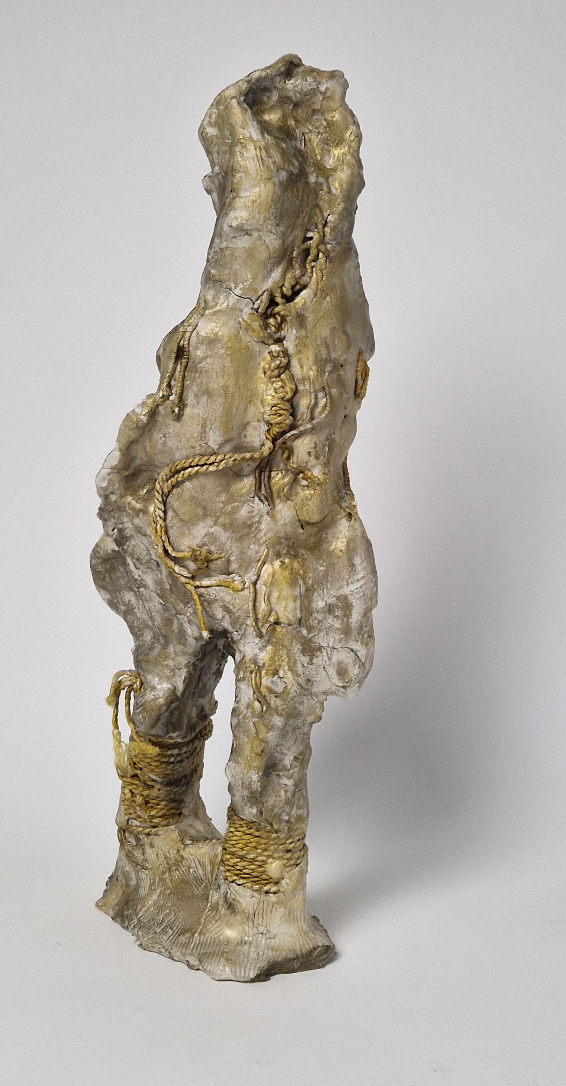 I compose these morphologies by combining textile work made of stretched threads, knots and braids with steel or clay. The combination of a hard, rigid material with a supple, malleable thread brings together the organic, the visceral and the structural, the skeleton. The roped material supplants the original body, healing wounds like a graft, a tutor or a prosthesis. Unfired clay remains alive, in the making.