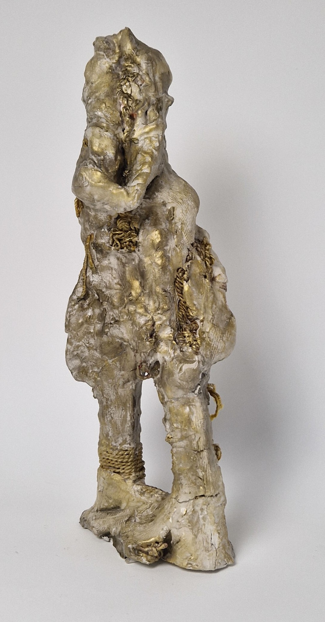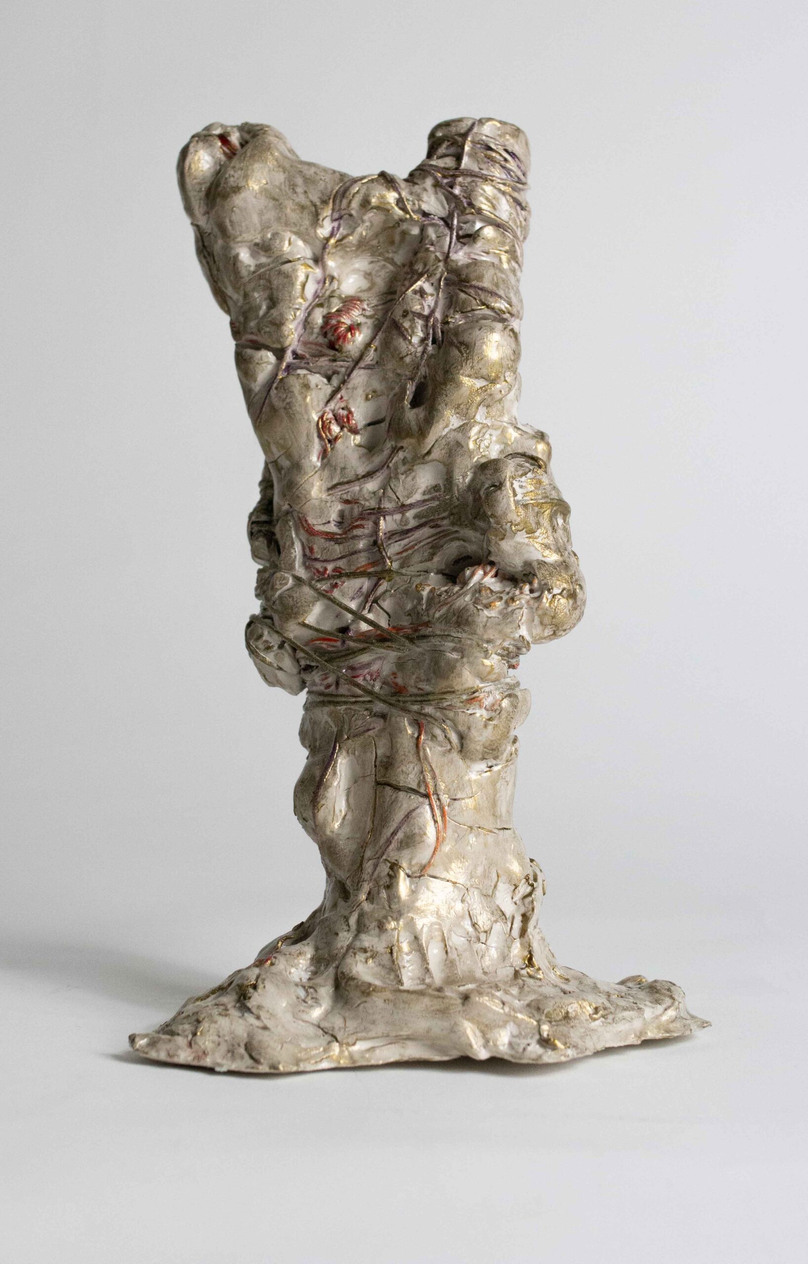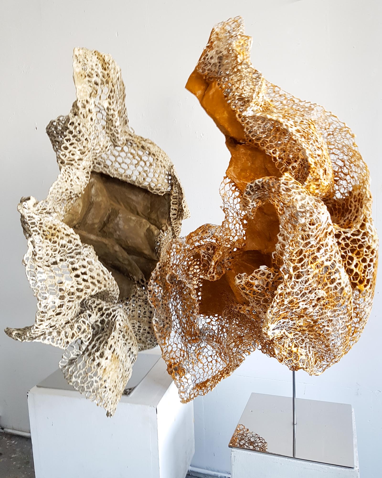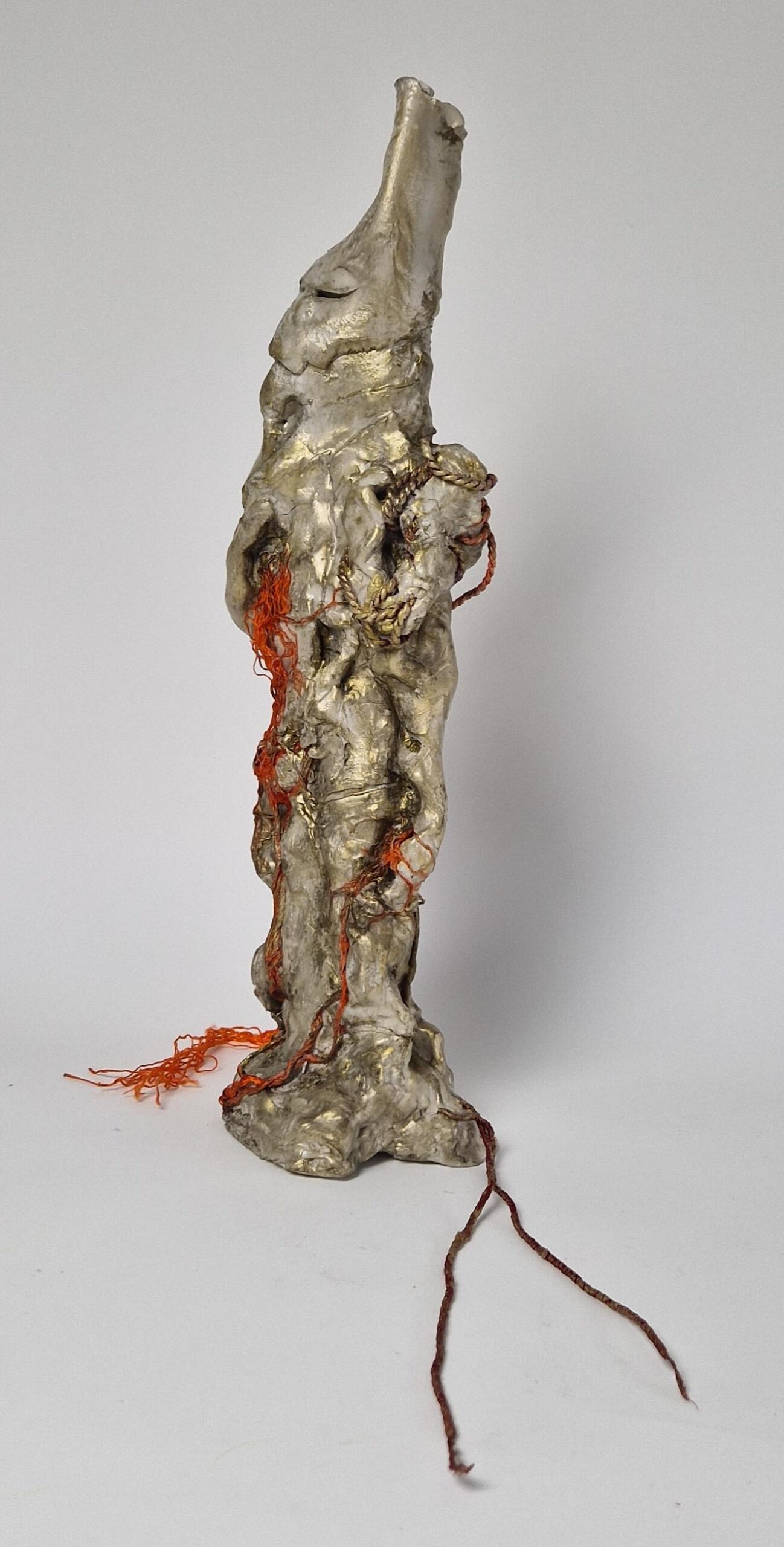 I compose these morphologies by combining textile work made of stretched threads, knots and braids with steel or clay. The combination of a hard, rigid material with a supple, malleable thread brings together the organic, the visceral and the structural, the skeleton. The roped material supplants the original body, healing wounds like a graft, a tutor or a prosthesis. Unfired clay remains alive, in the making.