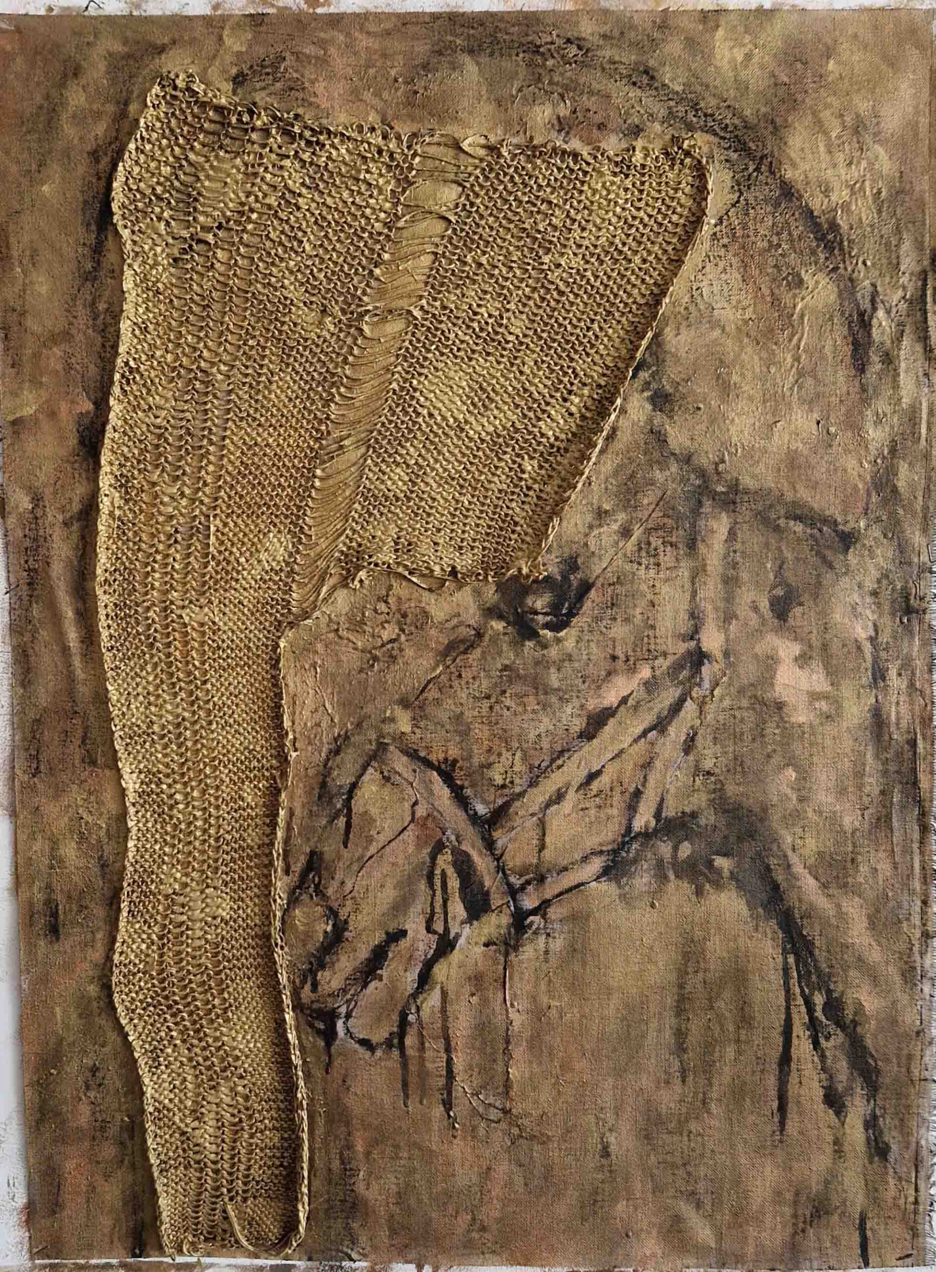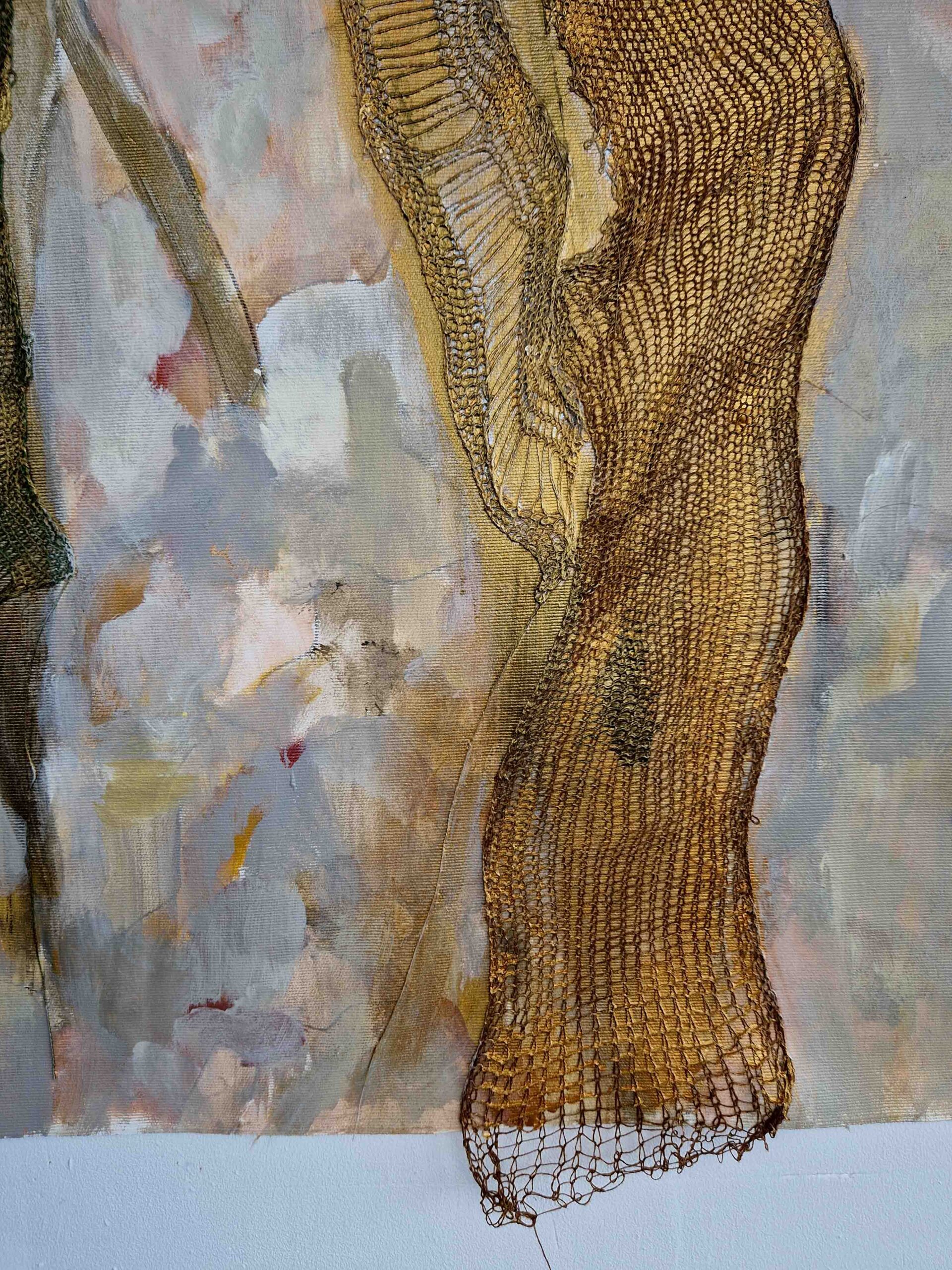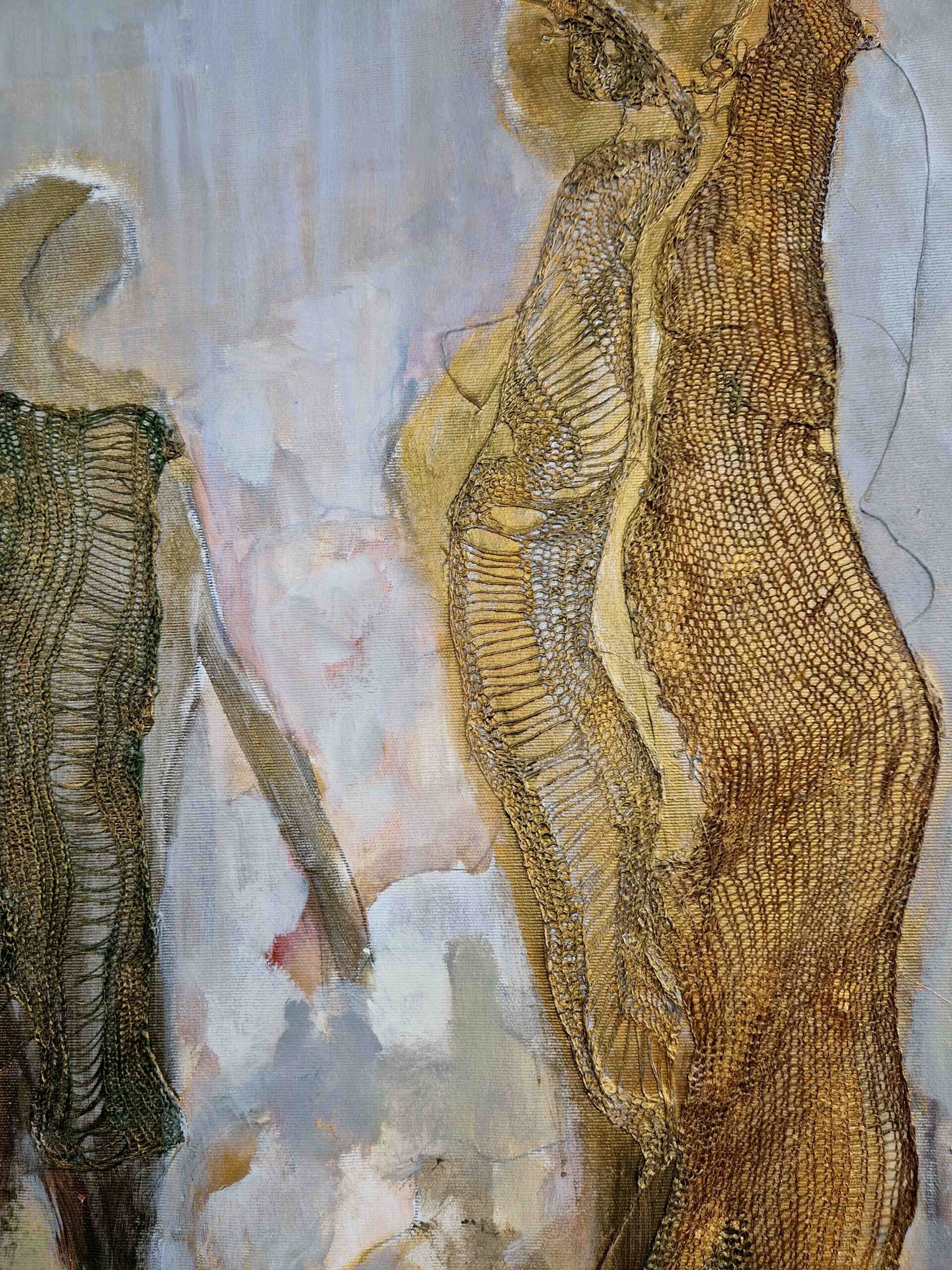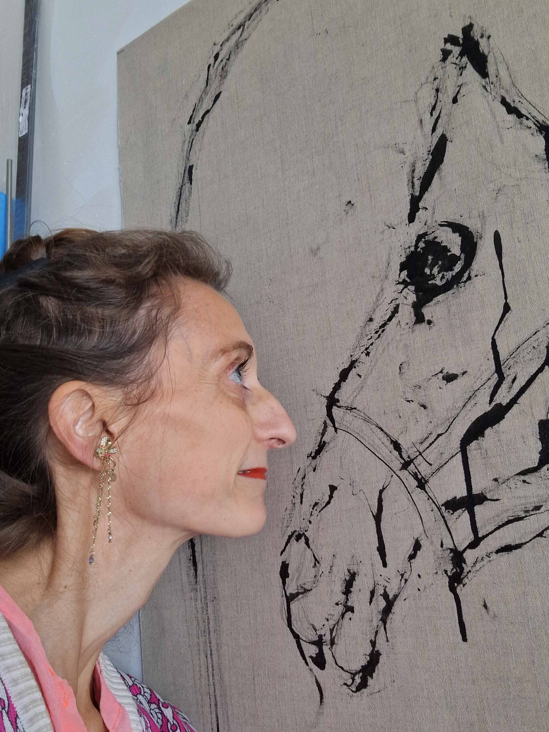In my work, I do not seek to show the equestrian world, but rather to convey the physical sensations, the essence of the link between humans and living animals, and the notion of care embodied in the relationship between the rider and their partner. Through lines, paint, and materials, memories come back to life, tactile sensations and feelings