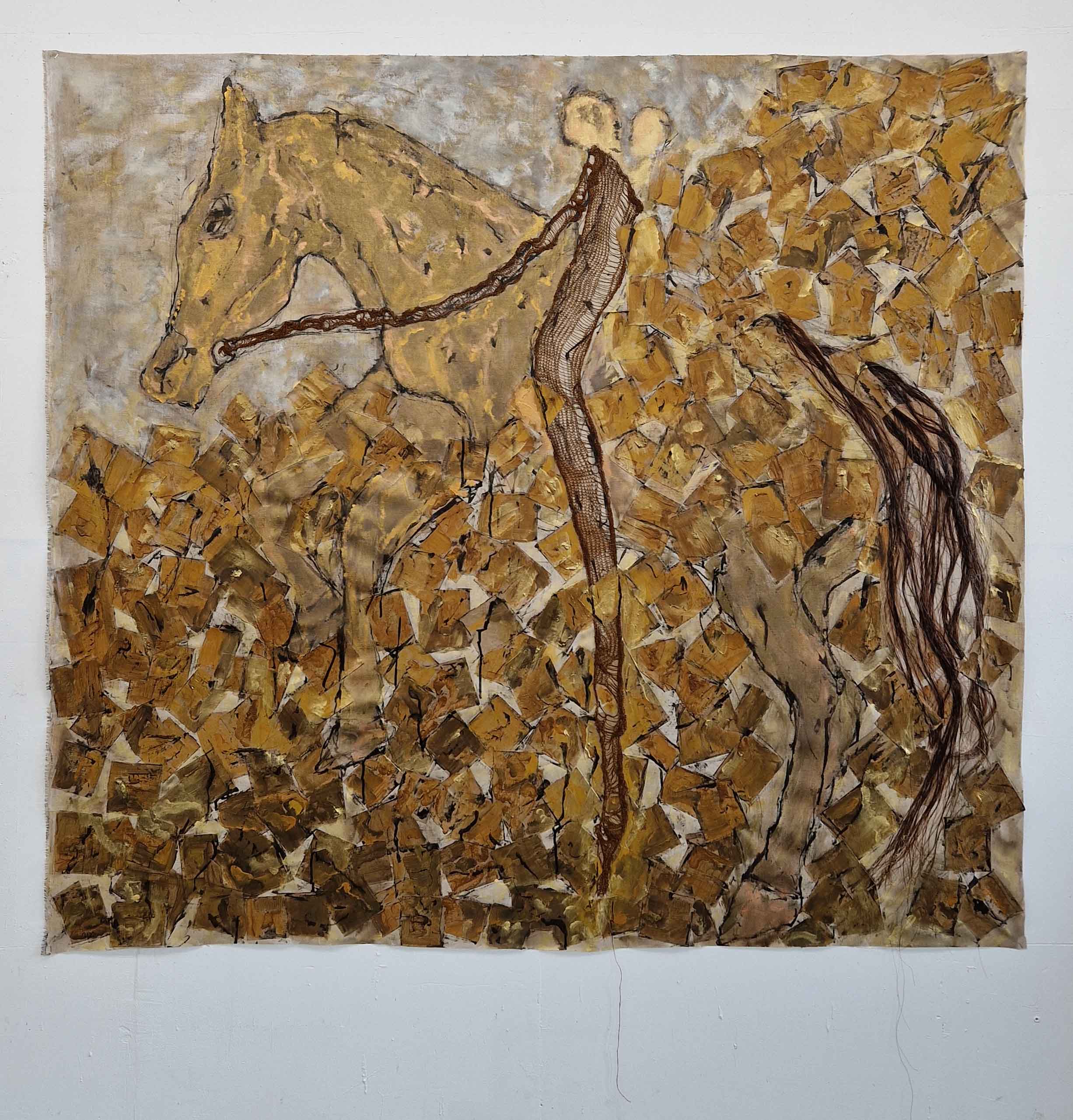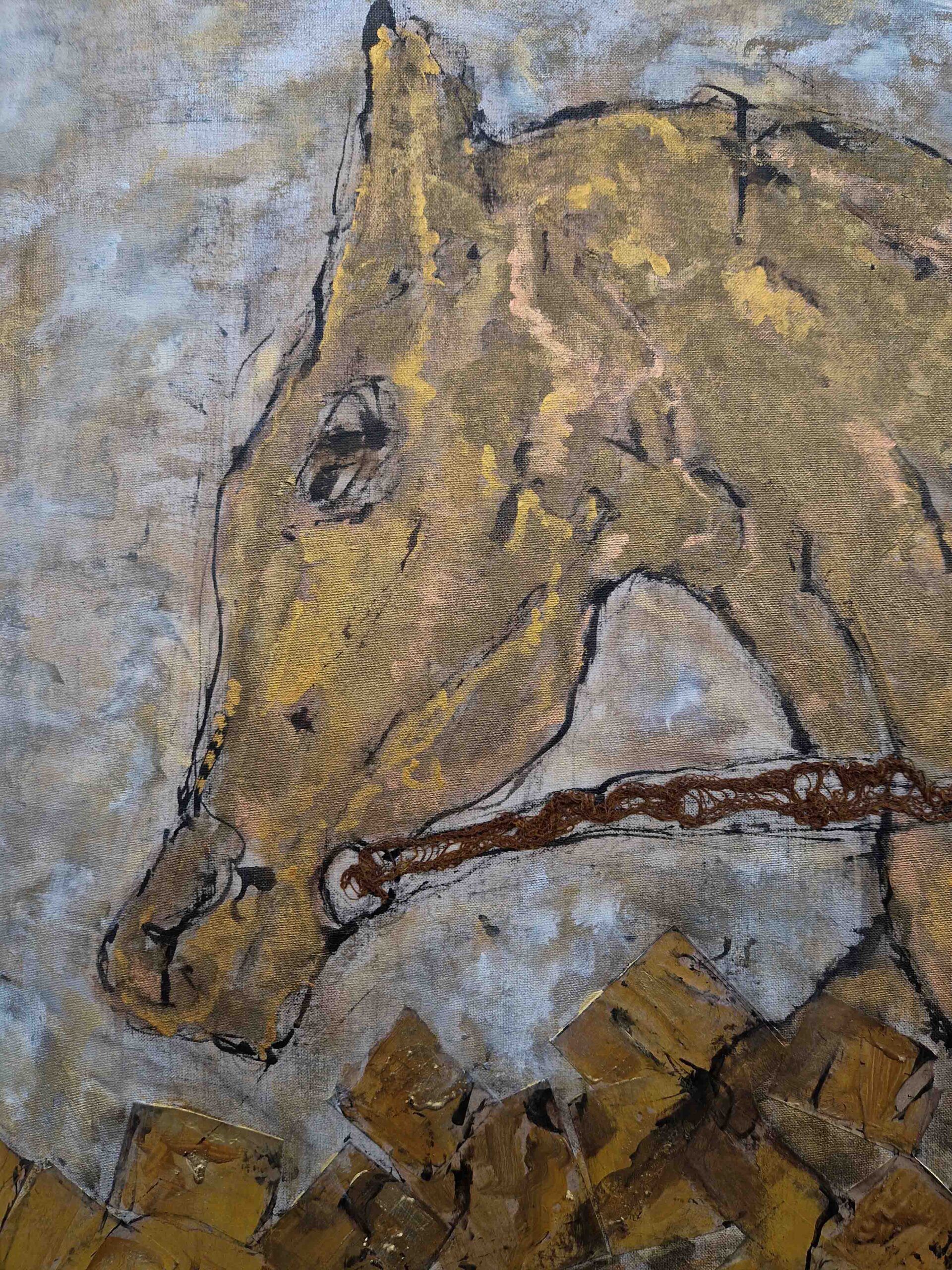 Dans mes œuvres, je ne cherche pas à donner à voir le monde équestre, mais je retranscris les sensations charnelles, l’essence du lien entre l’homme et le vivant animal, la notion de soin liée à la relation entre le cavalier et son partenaire. À travers le trait, la peinture, les matières, les souvenirs reprennent vie, les sensations tactiles et les sentiments gravés dans mon corps refont surface et je peux pleinement exprimer ce que veut dire être cavalière.